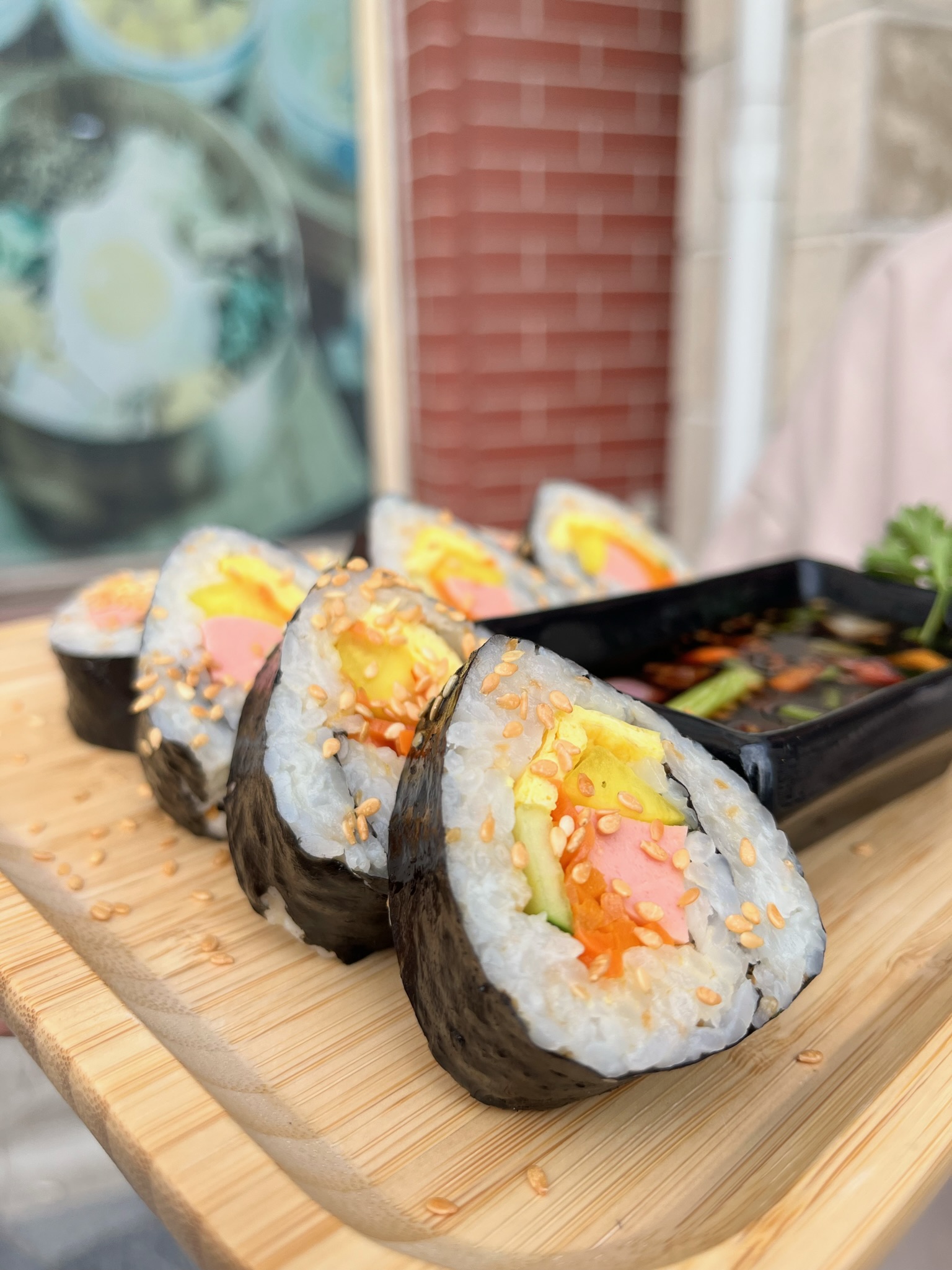 популярное корейское блюдо, представляющее собой рулеты из риса, завернутые в сушеные морские водоросли (ким) с различными начинками. Это сытная закуска, часто содержащая маринованную редьку, овощи, яйцо и мясо. От японских роллов отличается использованием кунжутного масла, а не уксуса.
